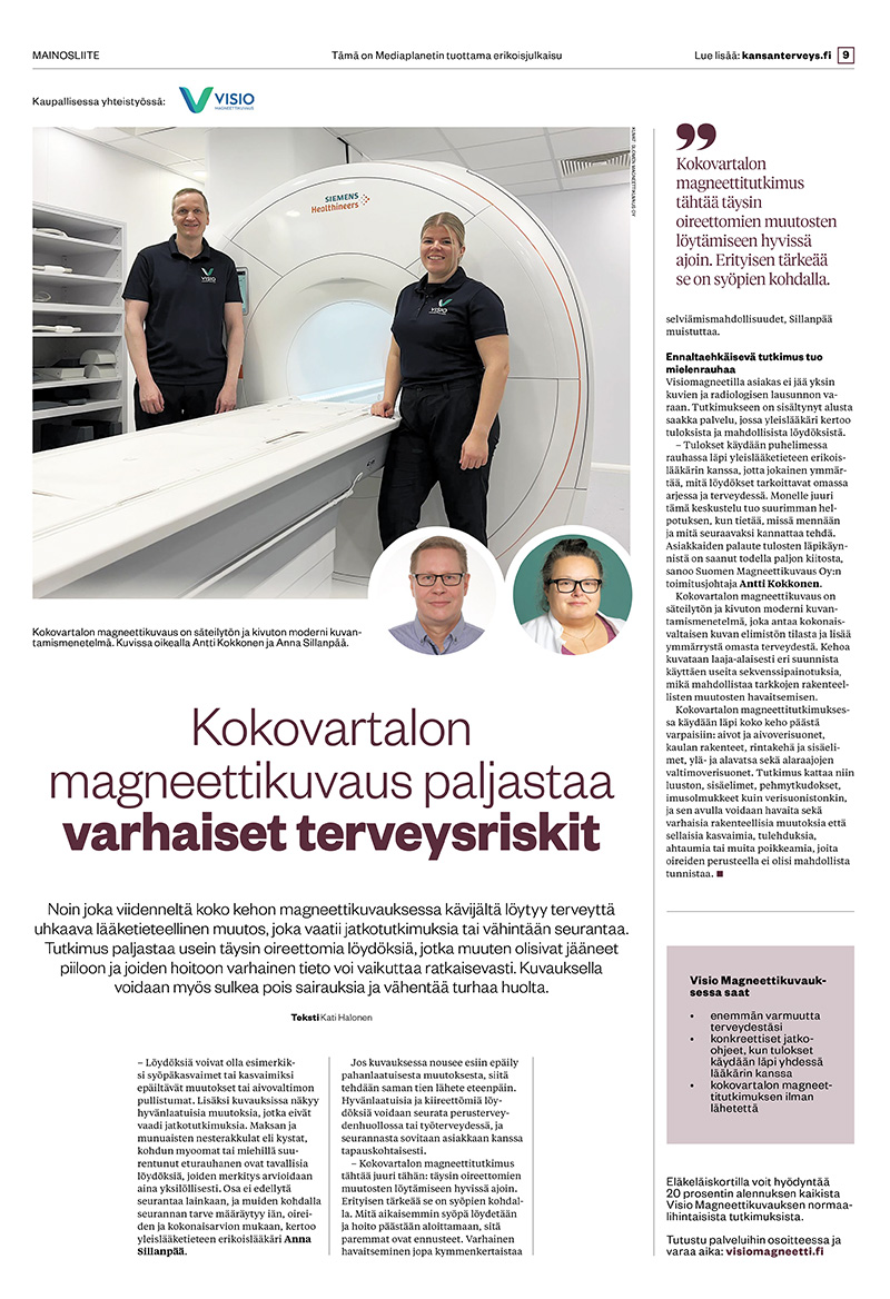 Visio Magneettikuvaus oli esillä Helsingin Sanomien Kultaiset Vuodet -liitteessä kertomassa koko vartalon magneettikuvauksesta ja sen merkityksestä vakavien sairauksien, kuten syövän, varhaisessa havaitsemisessa.